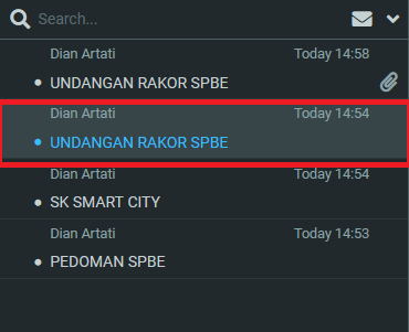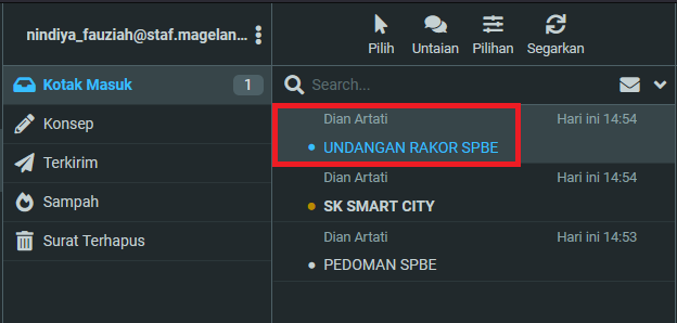 - Pilih email yang akan dibaca, klik dua kali pada email tersebut. Atau klik satu kali maka akan muncul pada halaman disebelah kanan