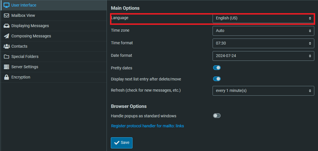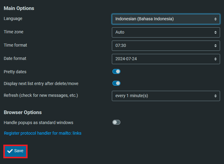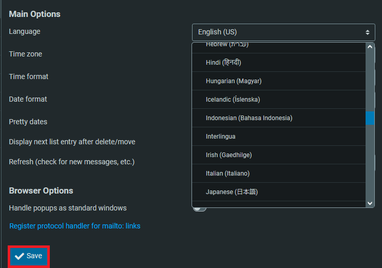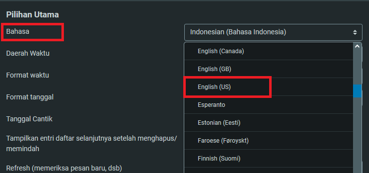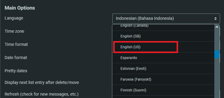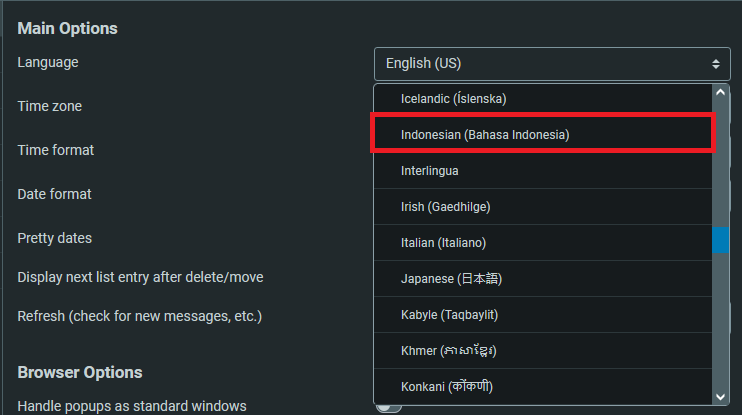 4. Pada Mail Options, bagian Language cari Indonesia (Bahasa Indonesia)