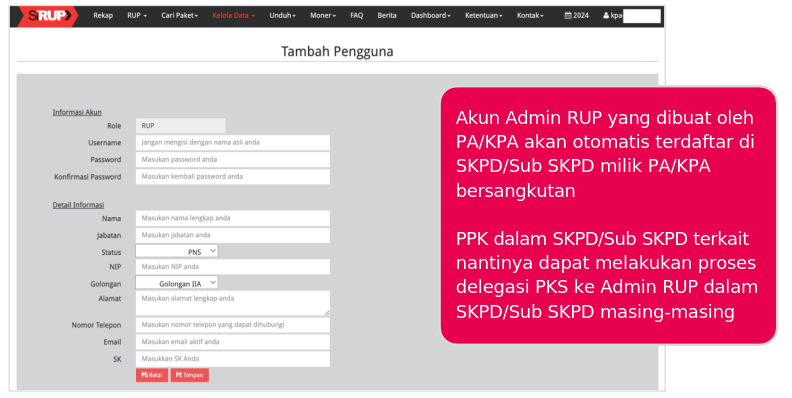 PA/KPA dapat membuatkan akun Admin RUP untuk membantu PPK dalam proses identifikasi pemaketan dan melengkapi paket RUP