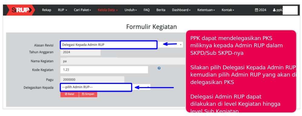 PPK dapat melakukan delegasi PKS ke Admin RUP untuk membantu proses identifikasi pemaketan