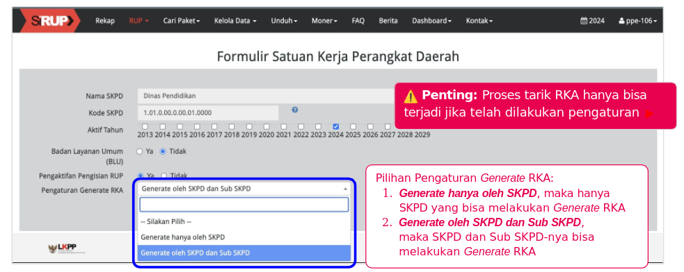 - Akun Admin PPE bertugas melakukan Pengaturan Generate RKA untuk setiap SKPD